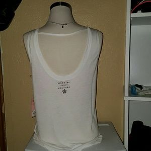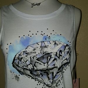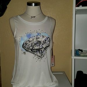 Gorgeous tank for summer, pair with short shorts. Features "diamond" stds on front with an open back. Very soft, fitted at bust and loose at hips. Size is an XS but this tank will fit up to a M body but with a bust no bigger than a small C....unless you want to wear it snug. Brand new with tag, smoke free home. 5