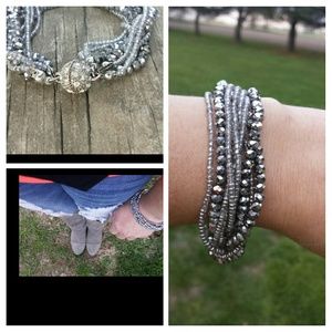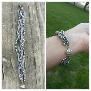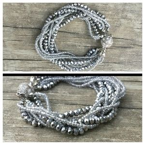 Super light weight Silver Multi Beaded Bracelet, With Full on Bling shine & sparkle! (Magnetic closure on the round ball end). Purchased from a Boutique store, very fun an unique piece of jewlery. Also looks great worn alone- or layered with other bangles & braclets. Pre-Owned In Great Condition.
