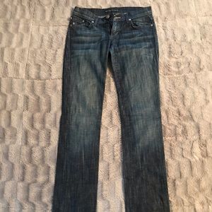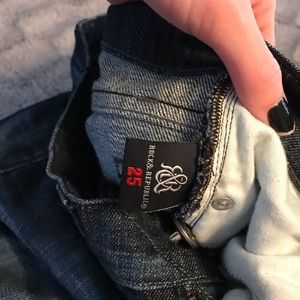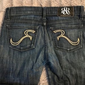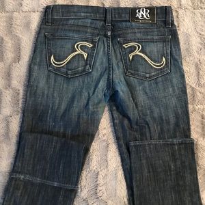 Worn twice and rolled so perfect condition, no fraying. Dark wash. Size 25, L: 34, rare long inseam. Skinny, straight style. Look amazing with heels and boots. Silver and gold thread detail.