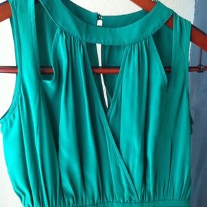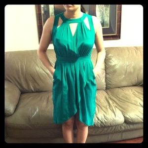 Like New! Bright emerald green silk dress. It has a tulip-like skirt and pockets. The top has a beautiful cage design. 100%silk. It's missing one of two buttons on the neck closure.