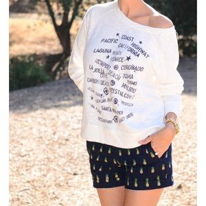 Only worn once no damages like new condition. Navy chino style shorts w/pineapple print. 5" long. 2 front 2 back pockets, side zipper. Thick material size 00. Last photos are photo credit from blogger the stylish housewife, has belt loops