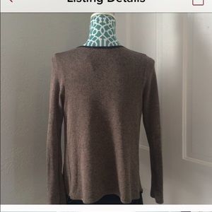 Brown cardigan with faux leather trim, longer in front. Size large, fits more like a medium. Length in front (longest part) 29 inches, Back length 23 inches