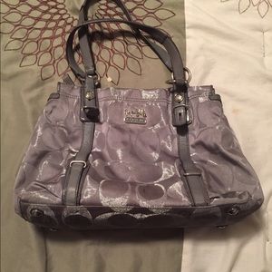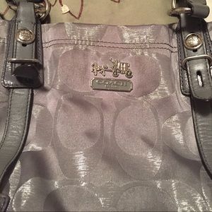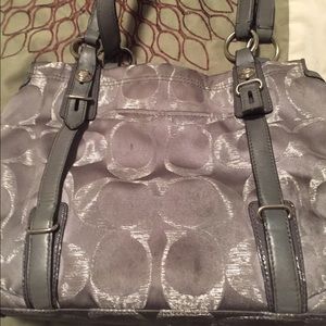 This is a gorgeous 100% authentic coach bag. A rare color to find , grey & silver tones. It is pre loved but in good shape , a few stains (seen in pictures) but I think they would be easy to get out. The leather handles are in good shape & no rips or tears. Such a beautiful bag with plenty of life left! A great size with lots of pockets ! Will negotiate through π