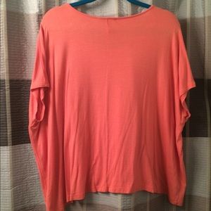 Best shirt ever. SO comfy and so chic. Easily pairs with jeans, leggings or shorts. Beautiful coral color. Wide arms. Would keep it but has gotten too big on me. Looked much cuter before and will look amazing on you! Purchased at lord and taylor.