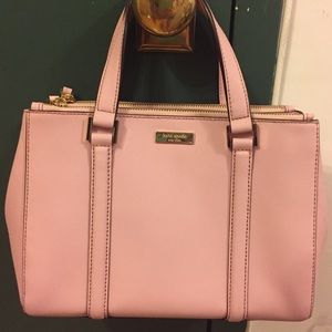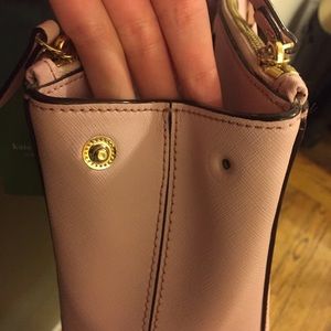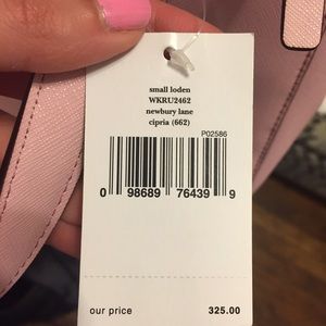 Brand new, with tags! Smoke free, pet free home. ksny Newbury Lane Small Loden in Cipria. Saffiano leather; 14-karat light gold hardware. 11" w x 8" h x 4.5" d. Top handles w/ 5" drop. Removable shoulder strap. One side snap closure is broken - however is not noticeable when carrying bag and can easily/cheaply be fixed by a cobbler. (I have the piece)