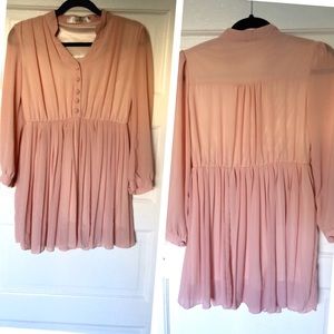 Sheer pink button up blouse. Tunic shirt with pleated bottom. Very cute with leggings. I bought this in a boutique in China.