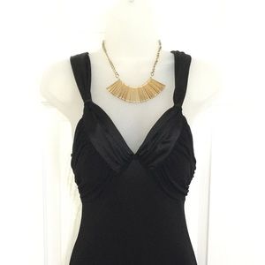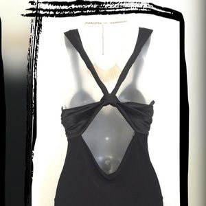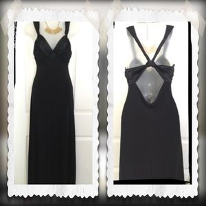 Black long elegant dress, polyester and spandex-very soft like material, back has criss cross with silk like material and open hole