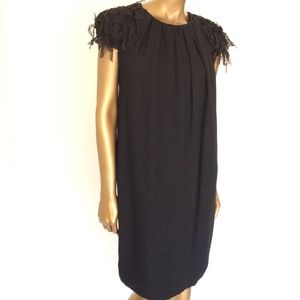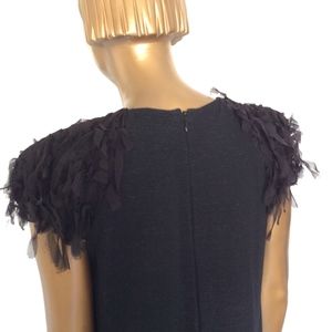 Straight cut, flowy, feathers on shoulders, pleated neck, cocoon dress. Wool material. Bust: 38". Waist: 40". Hip: 40". Length: 37".