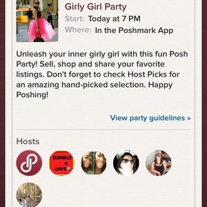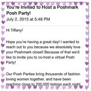 Congratulations Tiffany on co-hosting your very first (but sure to not be the last) Posh party!!! I wish you luck as you curate your coveted host picks. If you still are looking, please consider giving my closet a browse. I am Posh compliant and have many girly things! Good luck and have fun tonight!! See you there!! 🎉🎉🎉