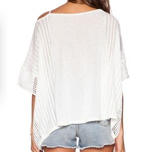 Cute summer cold-shoulder pullover sweater from Free People. Body of sweater is 55% ramie, 45% cotton. Lace is 100% cotton. Hand wash cold. Do not wring or twist to dry. Lay flat to dry. Size XS. Free People size charts it equivalent to fit a size 0 or 2. NWT no trades or Paypal please.