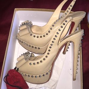 These are 100% AUTHENTIC Christian Louboutin Red Bottoms Size 38.5. The famous Lady CLOU 150 Calf/VIP Spikes with bow and peep toe. Worn multiple times, but clearing out closet for more new ones!! Feel free to ask questions. Missing 2 spikes but in the back and unnoticeable. Comes w/box (no top- can't seem to find it) & authentic dust bag & replaceable heel tabs. Also had bottoms done at Louboutin so I wouldn't slip in them. Sold as seen (used) in photos. Good luck! (EMAIL ME FOR CHEAPER PRICE!)