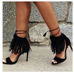 New with tag. EUR 37 US 6.5. High heeled with finges details. Lace up closure with tassels heel high 11cm/4". Upper 100% polyester. Lining 50% polyester 50% polyurethane. Color black