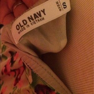 100% polyester. Beautiful floral print (pink, purple,white, light bronze, and light blue). Size small