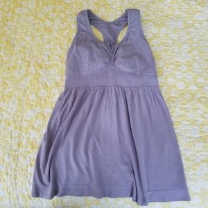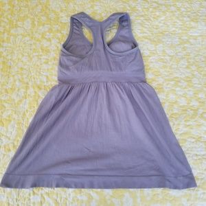 Really cute and comfy yoga racerback tank by Champion. Top has a little bit of flair to it in tummy area so you can work out comfortably. The body is 100% nylon and the bra portion is 90% nylon, 10% spandex. I think I wore it once so it is in new condition. I did notice some rub marks on the stomach area of the top and think it is most likely due to the nature of the material &from being in the closet as it hasn't been worn. Small could fit XS too. 10.5" flat across unstretched under breastline.