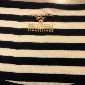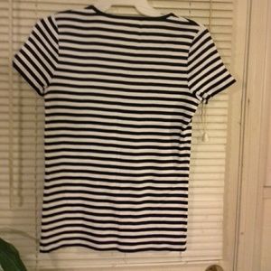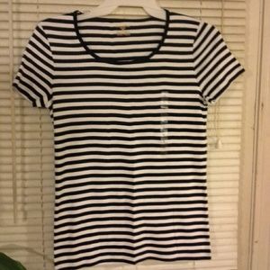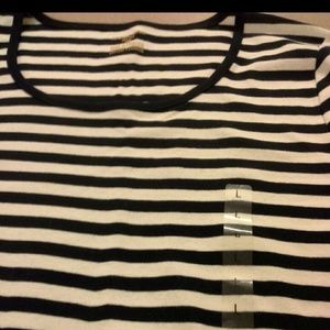 Scoop neck with short sleeves, dark blue and white stripped, looks like black in certain light. New and size L, and longer length.