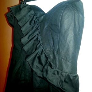 Gorgeous dress with shaped, lightly padded bust. Back slit, fitted skirt, just above the knee length. The fabric is thick with a nice sheen to it. Could be dressed up or down. Like new condition.