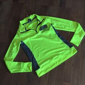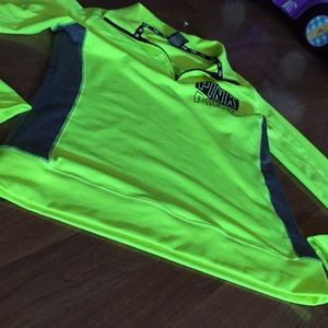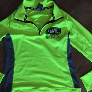 Super cozy and fitting half zip! True to size. It's a neon yellowish green color. Super bright and flattering. Open to trades