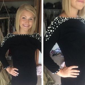 Black sweater material with gorgeous pearl details, deep V open back, worn once for this photo. There are no tags in it so I am unsure of the brand but definitely made well!