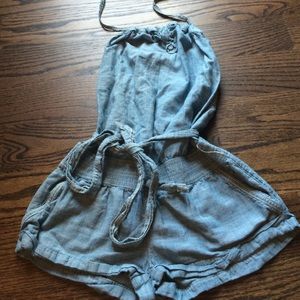 Light blue romper, belt brings in waist, pocket detailing on back, halter strings tie up