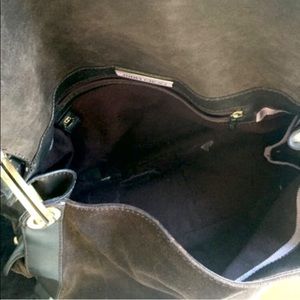 Rare chocolate brown suede Jimmy Choo shoulder bag with gold-tone hardware, tonal leather trim, single flat shoulder strap, three gusset pockets at exterior, beige suede lining, three pockets at interior wall; one with zip closure and push-lock closure at front flap. Interior has a few stains that a cobbler can easily remove (which I tried to capture in the last photo)