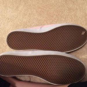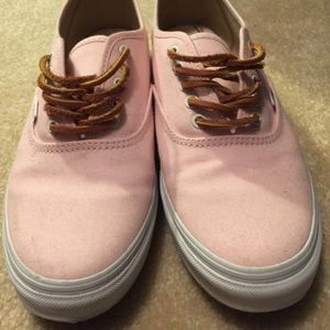 Light pink vans with brown leather laces. I love these but I only bought them to match a certain outfit that I no longer have so I am now wanting to sell them. They have only been worn 3 times.