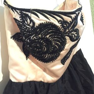 High quality Betsey Johnson prom, cocktail or evening dress. Belonged to my friend who was a designer for Betsey Johnson. From before BJ sold the company and purchased in NYC. Very short, strapless style in black flowy satiny fabric, with a gathered, bubble hem. Pale pink bodice in heavier satin with heavy black stitching embroidery and elegant black beading. Has removable straps with it. May have slight soiling at top of bodice - cannot be certain in my lighting. Recommend dry cleaning first