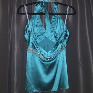 Marciano beautiful turquoise halter top. Sparkly beads and stones, not too tight of a fit, shows a great shape, ties behind the neck, zipper up the side