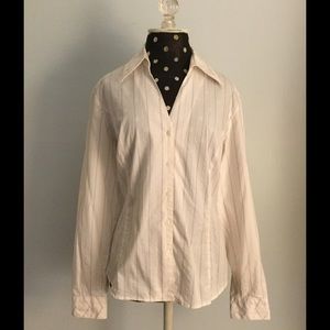 ✨This very Classic Blouse has the "Perfect Pinstripe Pattern". (Say that fast 3 times)! Very subtle lines in Navy; (or can appear Black depending what you pair it with). Great Princess Seam construction along with gentle stretch in fabric makes for a Super Fit! A Fabulous wardrobe Staple! NWOT. Never worn as it does not fit me.