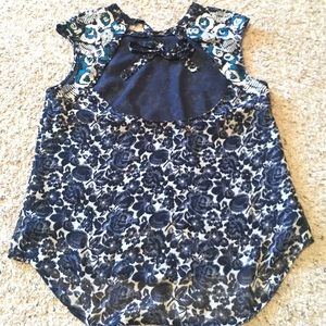 Blue and white floral top, capped sleeves with stitching on them. Low back with tie. Never been worn. Size medium. NO TRADES.