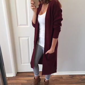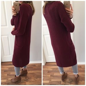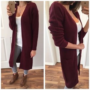 A perfect shade of maroon for fall! This long sweater cardigan is a must have. Brand new with tags. Thicker knit and very soft. Has two front pockets with an open front. I'm modeling the small. Size MEDIUM available. 100% acrylic. M: 40" long • 19" across the chest • 25" sleeves that look cute rolled as well▫️ Please do not purchase this listing ▫️