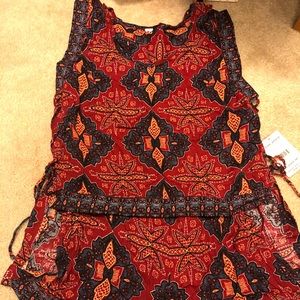Printed tank and short set. Tank has side lace up detailing and a high low hem. Shorts feature a cuffed hem, flat front, and hidden side zip closure.
