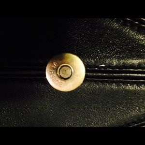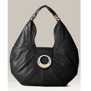 Preloved. 100% authentic. Inset stones glitter on a goldtone logo ring with some scratches on the metal circle at the flap front of a wonderfully supple, paneled black leather hobo bag. Leather is in perfect condition except at one panel on the front barely visible. The magnetic closure unglued and was repaired but not original to the bag see pics. Gold tone rings detail the handle.