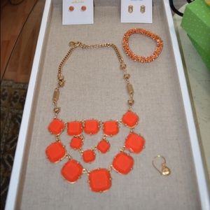 Orange epoxy stones set in brass plated in gold. Adjustable length. Lightweight.