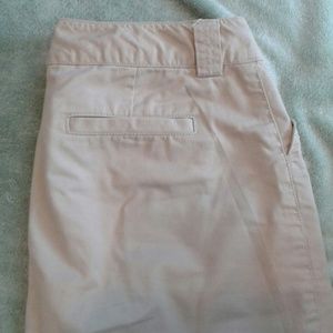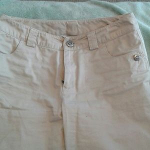 Light tan with button detail on front pockets, 2 rear pockets still tacked shut. 100% cotton. Inseam is 32".