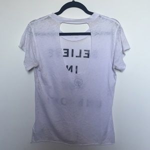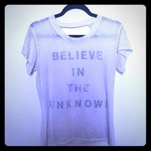 Super soft burnout jersey material tee with cutout back starting along collar. "Believe in the unknown" is printed on the inside of the shirt so appears subtly when being worn. Fit is very easy and sexy. 🔮