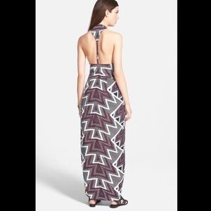 Make a chic statement in a sweeping maxi dress featuring a strappy camisole bodice with a slinky T-back and an allover geometric print. -