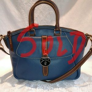 Beautiful leather Dooney and Bourke satchel crossbody has double handle with a 4" drop. Detachable and adjustable strap, and includes dust cover. Lined interior has two front wall media pockets, one back wall zip pocket, key keeper. Exterior front with signature goldtone lock on pocket with magnetic closure. Authenticity guaranteed. Gorgeous color perfect for this fall season!