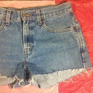 Thick, high quality shorts with distress at the bottom. They do say size 5 in the shorts themselves but i am a 4 and they for me perfectly. When worn they go up to just a little below the belly button on me. No front pockets. Prices are negotiable! If you have any questions feel free to ask‼️💗💗💗💗 could fit 26-28 waist. Make offers! Ask about Ⓜ️erc ari. Levi's but listed as brandy for exposure :)