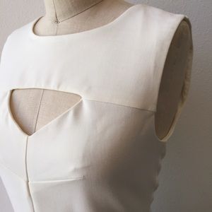 Clean and polished ecru fit & flare #mini dress from French Connection. Sleeveless, with a cut-out at the front bustline. Fitted in the bust and waist, with a flared circle skirt. Fabric is a super stretchy rayon blend; fully lined, and dry clean only. Size US 6, fits a big 4/true 6 best. Length from shoulder: 34" Bust: 34" Waist: 28" ** measurements taken with garment lying flat; without stretching.