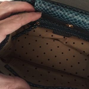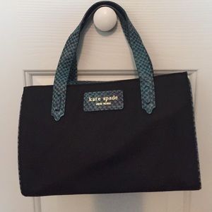 Cute Kate Spade navy nylon and faux snake skin. 9 3/4" wide by 6 1/2" tall. No issues. Authentic