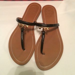 These sandals were worn once outside on a sidewalk, so they are in pretty nice condition. Description: T logo flat thong-patentsaffiano 😘