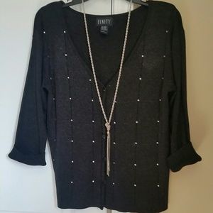Sweater size medium, black nylon with sparkle throughout and studs only in front ,button up in front, looks brand new worn once. Skirt size 6 is 100% polyester fitted at waist flare at bottom half both pieces are very chic & comfortable.