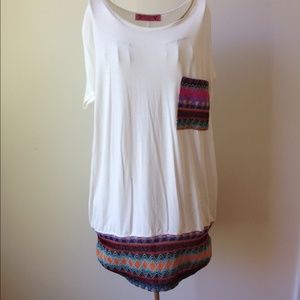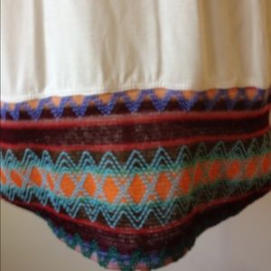 Cute cream colored tunic with multi-colored braided band at bottom hem and on breast pocket. Never worn. Shell is 95% rayon, 50% spandex. Braided band is 96% polyester, 4% spandex. Dry clean. No trades or Paypal please. NWOT