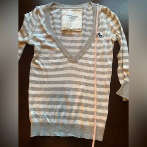 Gray & white striped A&F sweater. It's a v-neck and sleeves are 3/4 length. Lightweight and perfect for layering. It's from Abercrombie & Fitch so their size x-small runs on the smaller size. Perfect for petites!