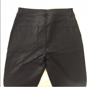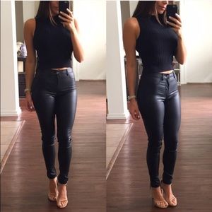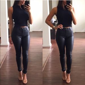 High waisted faux black leather pants. These pants have a great fit and are so flattering. Also looks nice worn as leggings with a loose sweater over it. I am wearing the size Small in the pics. The large runs very small, it actually fits like a M. Brand new