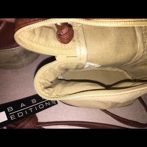Bucket bundle crossbody bag. The tan has a mark as shown on the picture. It's 6 inches by 6 inches. But still a great bag.