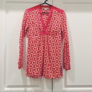 Michael Kors tunic, red with white circle pattern. V-neck and more fitted in chest, loose fitting below chest. Long, reaches below waist.