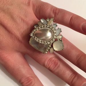 BNWT handmade pearl and crystal statement ring. Glass stones, rhodium plating. Non-pinch stretch band.