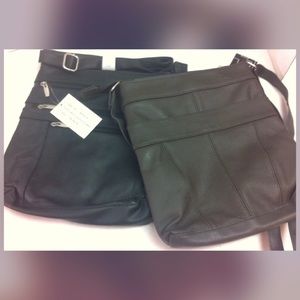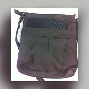 I use one of these for travel. It has 3 zippered compartments on front - one top zippered compartment and one back slot pocket. The strap is adjustable. Your iPad or mini can fit in back slot pocket as shown in pic or down inside top zippered compartment to be fully protected. All leather and I have in black or dark chocolate brown. Large bag - 10.5 long and 11.5 high. Handle drop is 27 inches and can be made shorter. I have 1 black and 1 brown left. Tell me your choice please