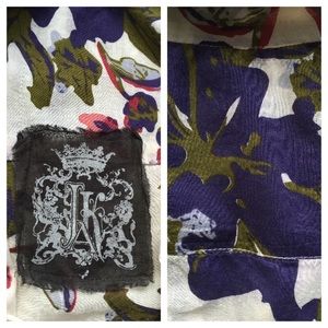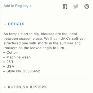 Floral cotton buttondown shirt by Jak for Anthropologie. Worn one time before I became pregnant and then buried in my closet until now. I did remove the weird square fabric "Jak" tag that was stitched inside because it was falling off when I bought the shirt (bad design Anthro!). I kept the tag though, as you can see in the last pic. You can also see both the inside where the tag was and the back where the stitching for the tag would be (shown to demonstrate the shirt still looks great!!!).